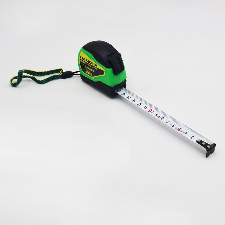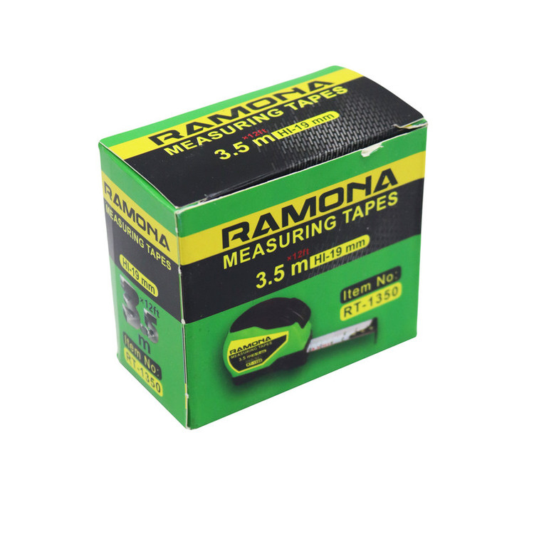 - متر 3.5 متری رامونا - پهنای نوار : 19 میلی متر - داری دکمه برای جمع کردن و قفل کردن نوار - درجه بندی سانتی متر - کیفیت بالا - نوار فلزی و نشکن