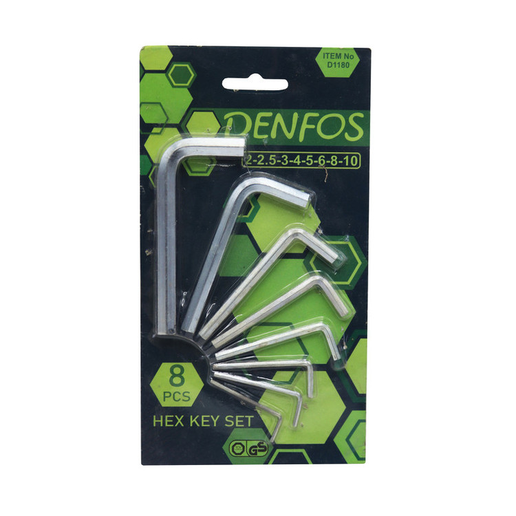 - آچار آلن دنفوس مجموعه ۸ عددی - درای ۸ عدد آجا الن در سایز های : ۲ - ۲.۵ - ۳ - ۴ - ۵ - ۶ - ۸ - ۱۰ - درای دسته استاندارد - کیفیت بالا - جنس: آهنی